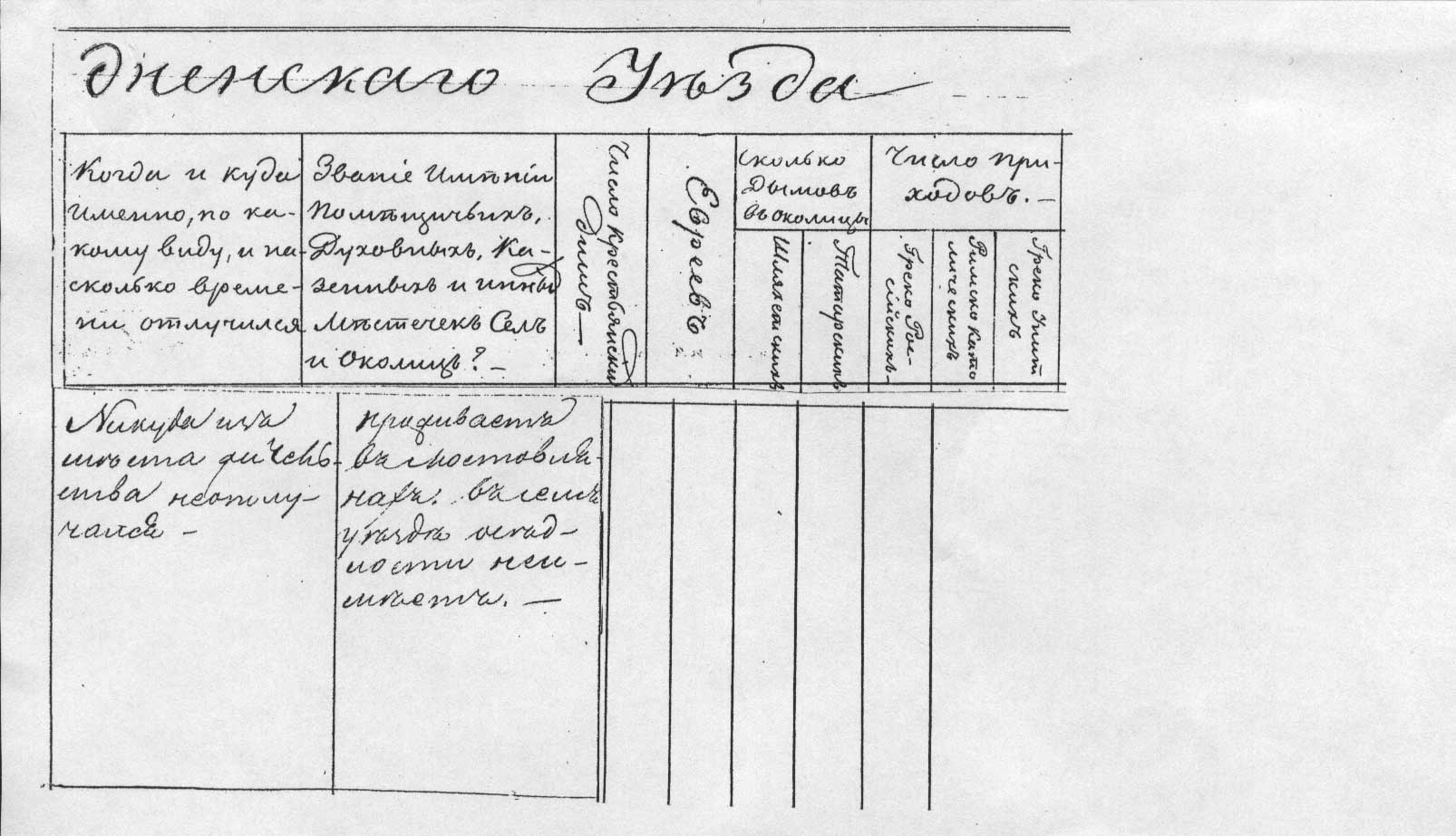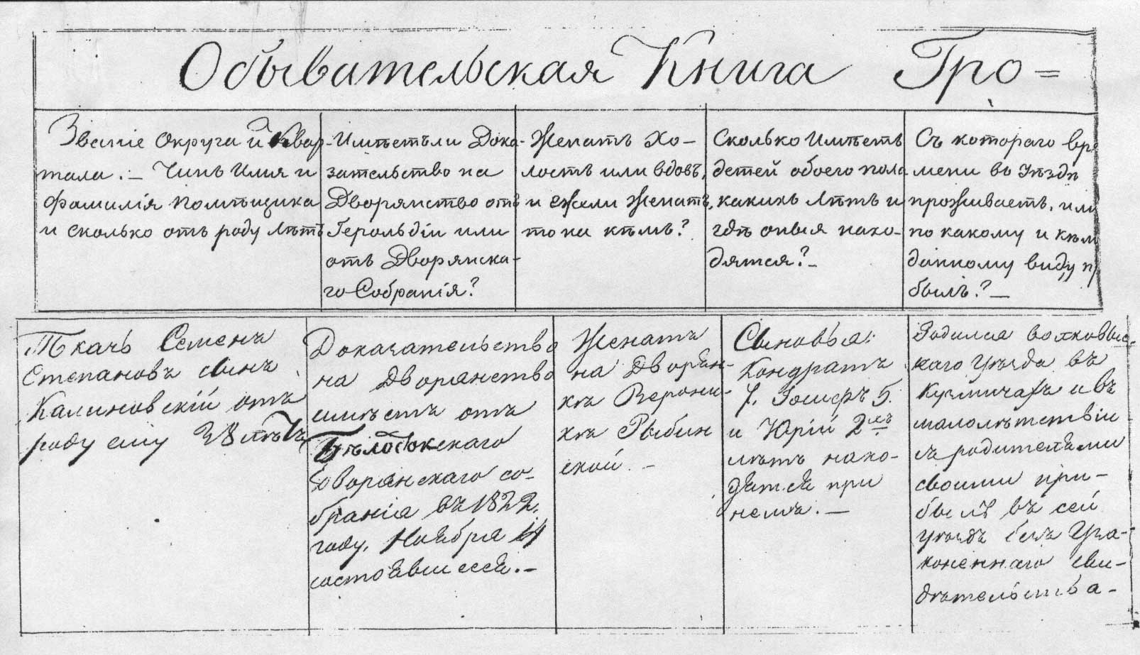 Званіе округа и квартала. Чинъ семьи и фамилія помѣщика и сколько отъ роду лѣтъ | Имѣетъ ли Доказательство на Дворянство отъ Геральдіи или отъ Дворянскаго Собранія? | Женатъ, холостъ или вдовъ, и ежели женатъ, то на комъ? | Сколько имѣетъ детей обоего пола, какихъ лѣтъ, и гдѣ оныя находятся? | Съ котораго времени въ уѣздѣ проживаетъ или по какому и кѣмъ данному виду прибылъ? | Когда и куда именно, по какому виду и на сколько времени отлучился | Званіе имѣніи помѣщичьихъ, духовныхъ, казенныхъ и инныхъ мѣстечекъ, селъ и околицъ? |