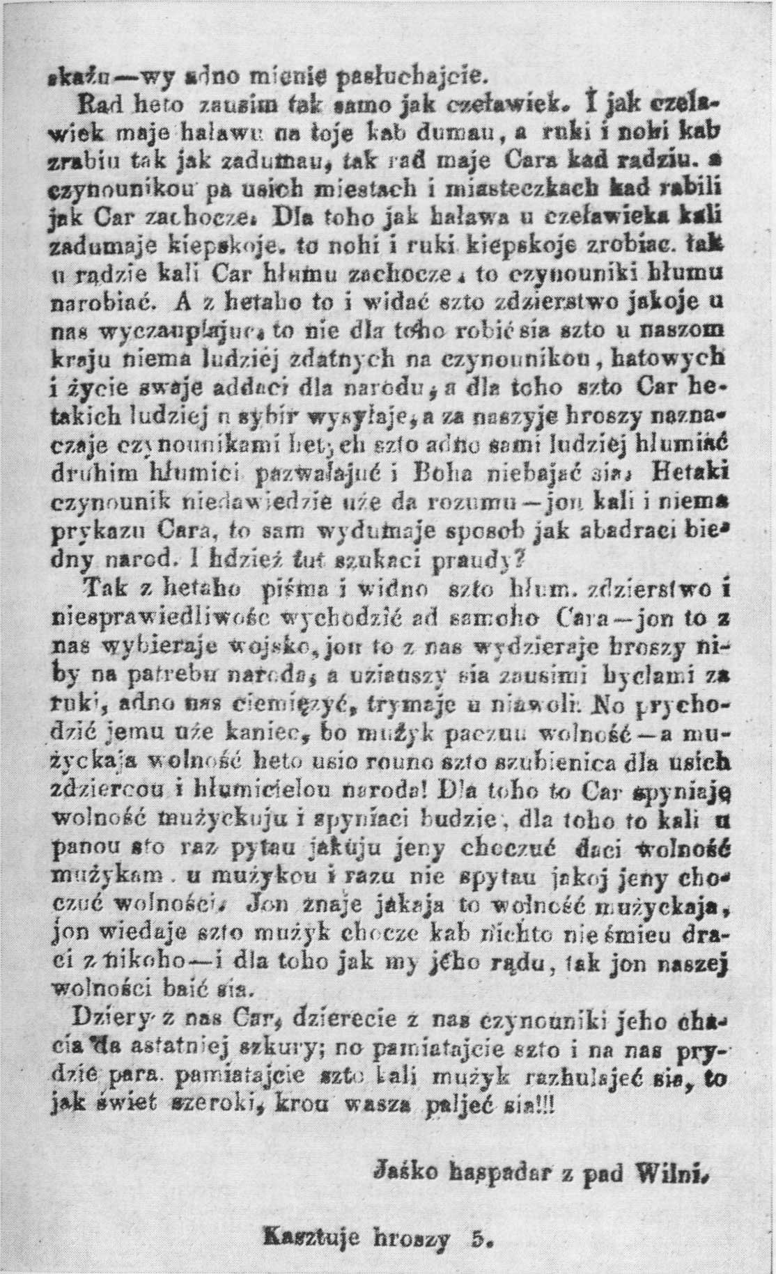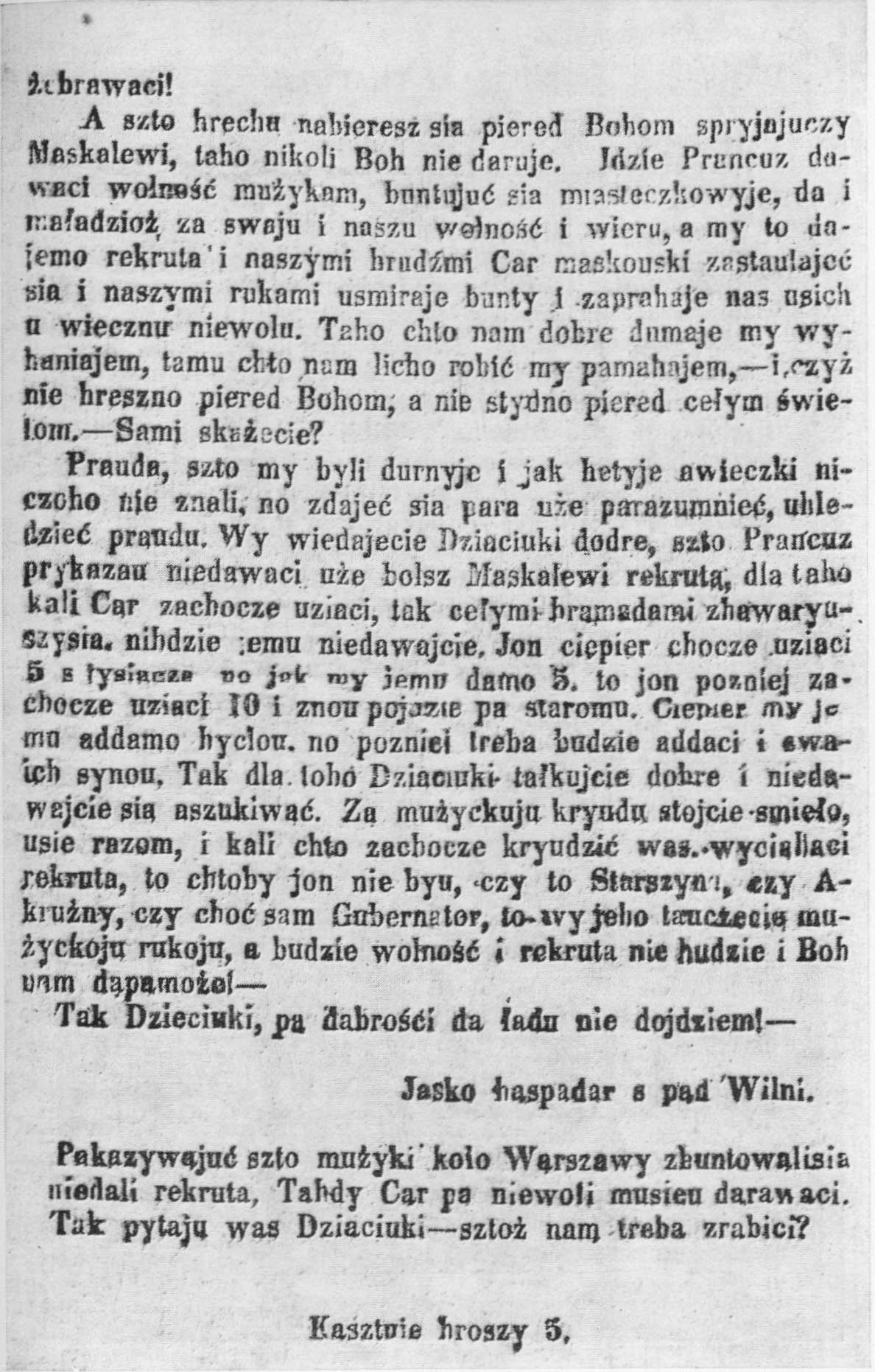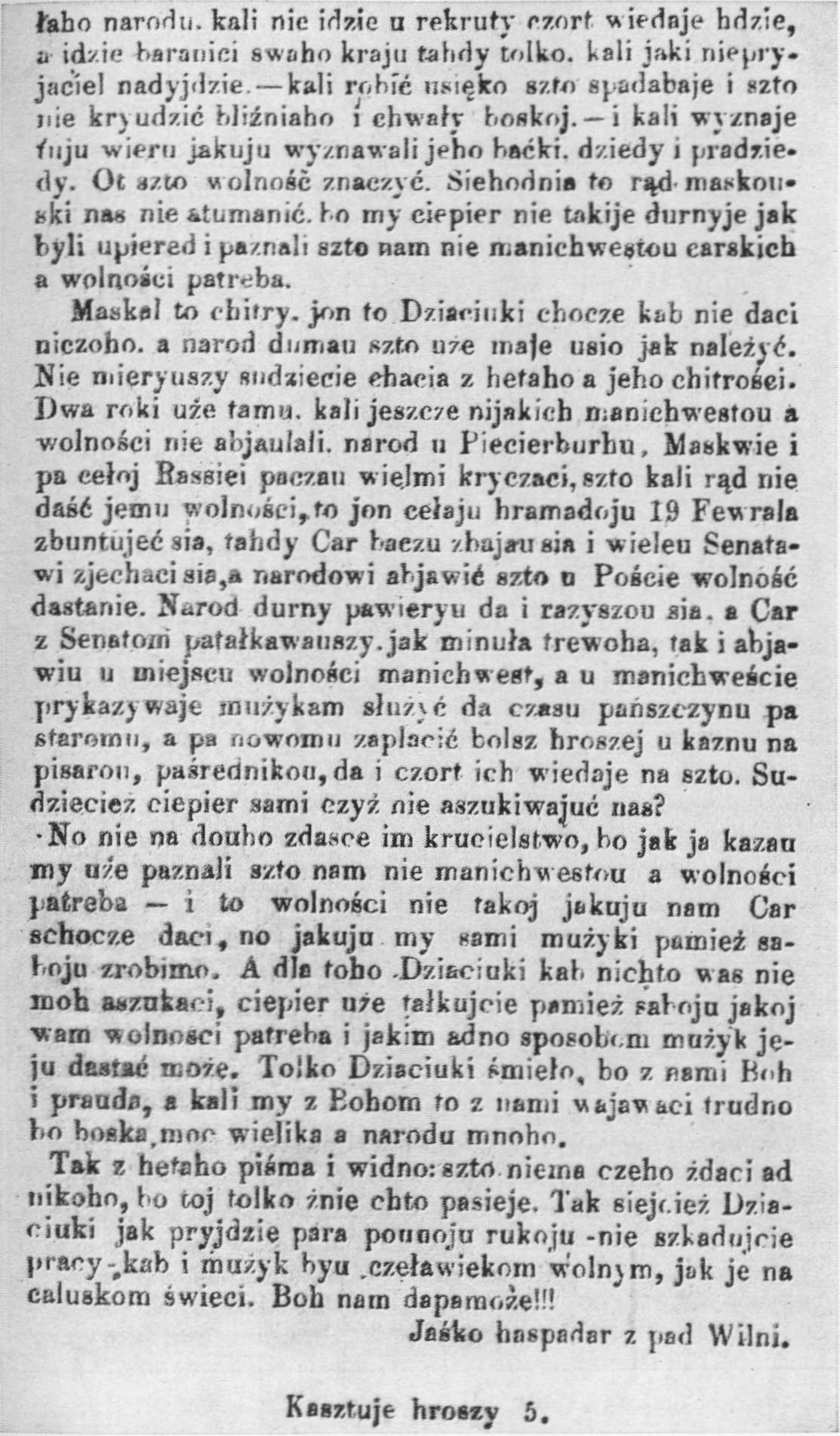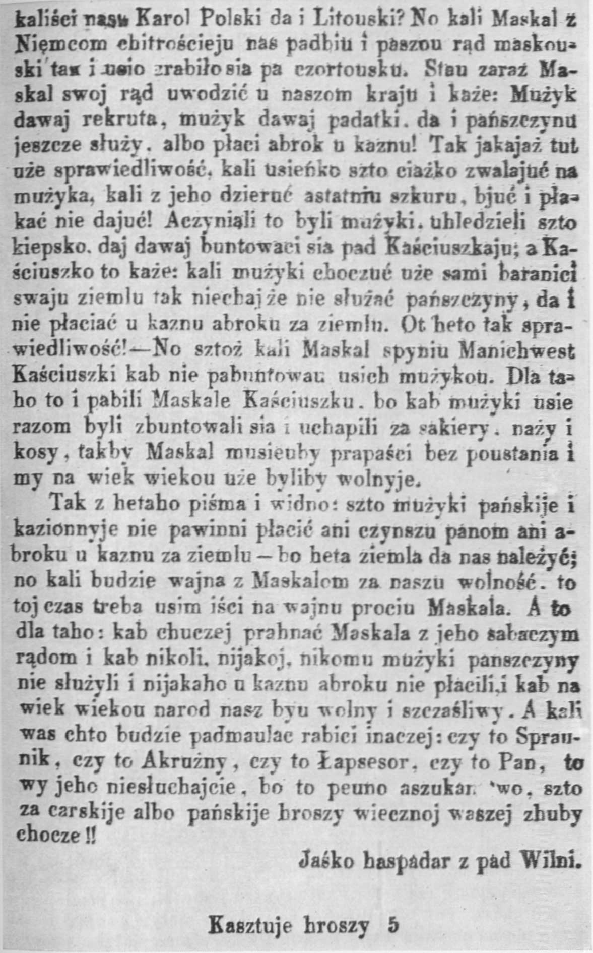 Падумайце добра, да, памаліўшыся Богу, станьма дружна разам за нашую вольнасць! Нас цар ужэ не падмане, не падвядуць маскалі*! Няма для ніх у нашых селах ні вады, ні хлеба, для ніх мы глухі і немы – нічога не бачылі і не чулі. А покуль яшчэ пара, трэба нашым хлопцам спяшыць з віламі да з косамі там, гдзе дабіваюцца волі да праўды – а мы, іх бацькі да жонкі нашы, сцерагці будзем, да ўведамляць, адкуль на ніх цягне нячыста маскоўска сіла, да ад душы памагаць усялякімі спосабамі дзецюкам нашым, што за нас пойдуць біцца. – А будзе ў нас вольнасць, якой не было нашым дзядам да бацькам. Яська, гаспадар з-пад Вільні.