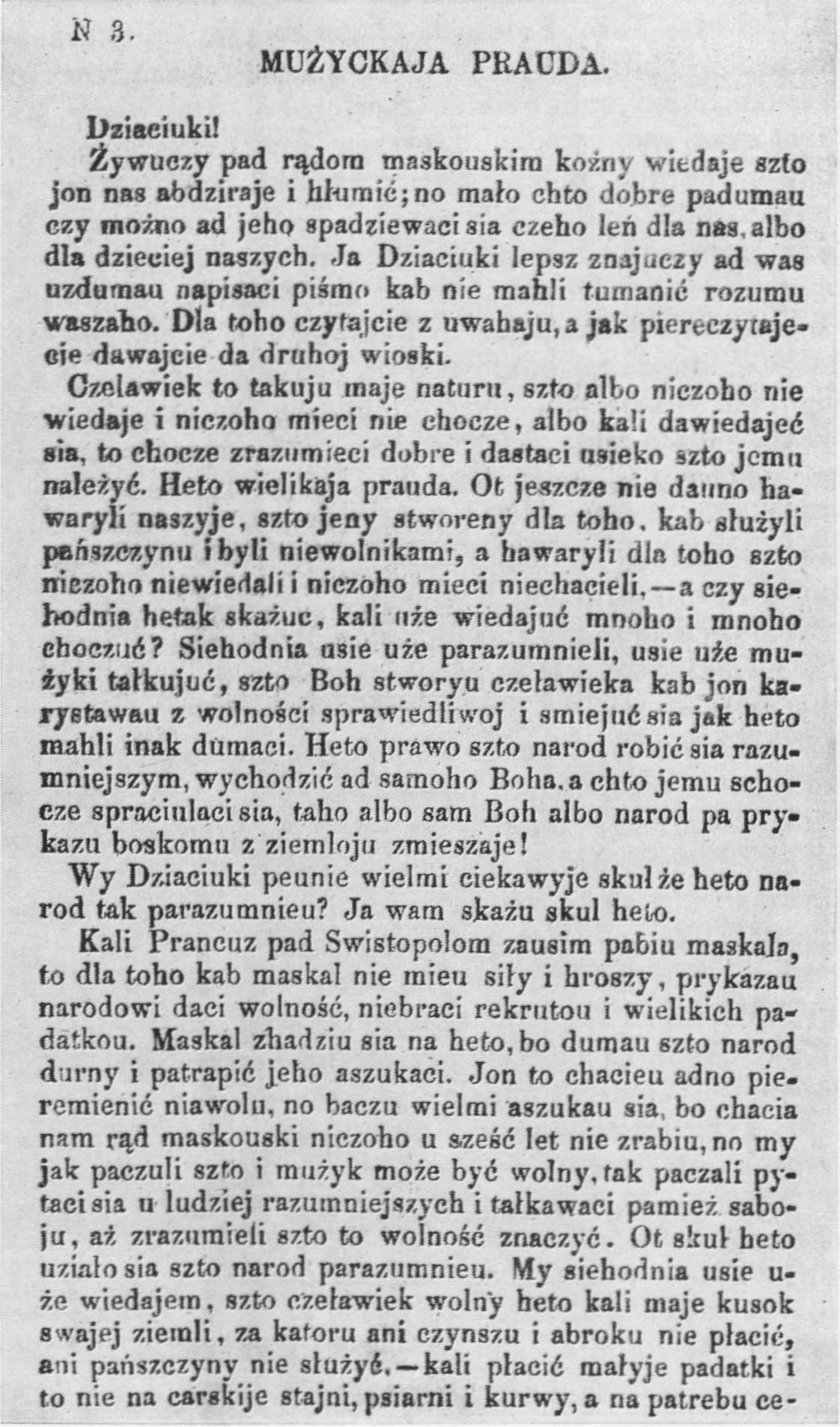 Калі Пранцуз* пад Свістаполём* заўсім пабіў маскаля*, то для таго, каб маскаль* не меў сілы і грошы, прыказаў народаві* даці вольнасць, не браць рэкрутаў і вялікіх падаткаў. Маскаль* згадзіўся на гэта, бо думаў, што народ дурны і патрапіць яго ашукаці. Ён то хацеў адно перамяніць няволю, но, бачу, вельмі ашукаўся, бо хаця нам ронд* маскоўскі нічога і шэсць лет не зрабіў, но мы як пачулі, што і мужык можа быць вольны, так пачалі пытаціся ў людзей разумнейшых і талкаваці памеж сабою, аж зразумелі, што то вольнасць значыць. От скуль гэта ўзялося, што народ паразумнеў. Мы сягодня ўсе ўжэ ведаем, што чалавек вольны, гэта калі мае кусок сваёй зямлі, за катору ані чыншу, і аброку не плаціць, ані паншчыны не служыць, – калі плаціць малыя падаткі, і то не на царскія стайні, псярні і курвы, а на патрэбу цэлага народу, калі не ідзе ў рэкруты чорт ведае гдзе, а ідзе бараніці сва[й]го краю тагды толька, калі які непрыяцель надыдзе, – калі робіць усенька, што спадабае і што не крыўдзіць бліжняга і хвалы боскай, – і калі вызнае тую веру, якую вызнавалі яго бацькі, дзяды і прадзеды. От што вольнасць значыць. Сягодня то ронд* маскоўскі нас не атуманіць, бо мы цяпер не такія дурныя, як был ўперад, і пазналі, што нам не маніхвэстаў царскіх, а вольнасці патрэба.
