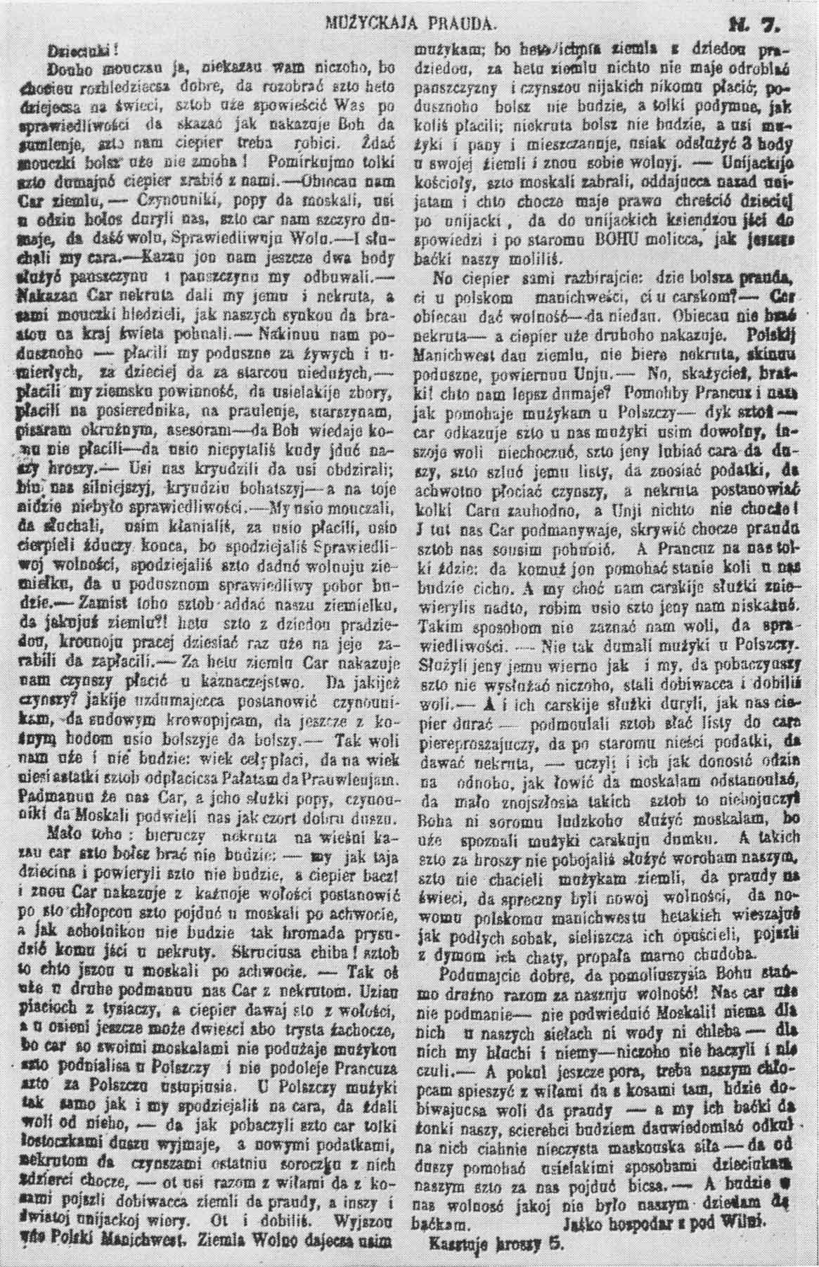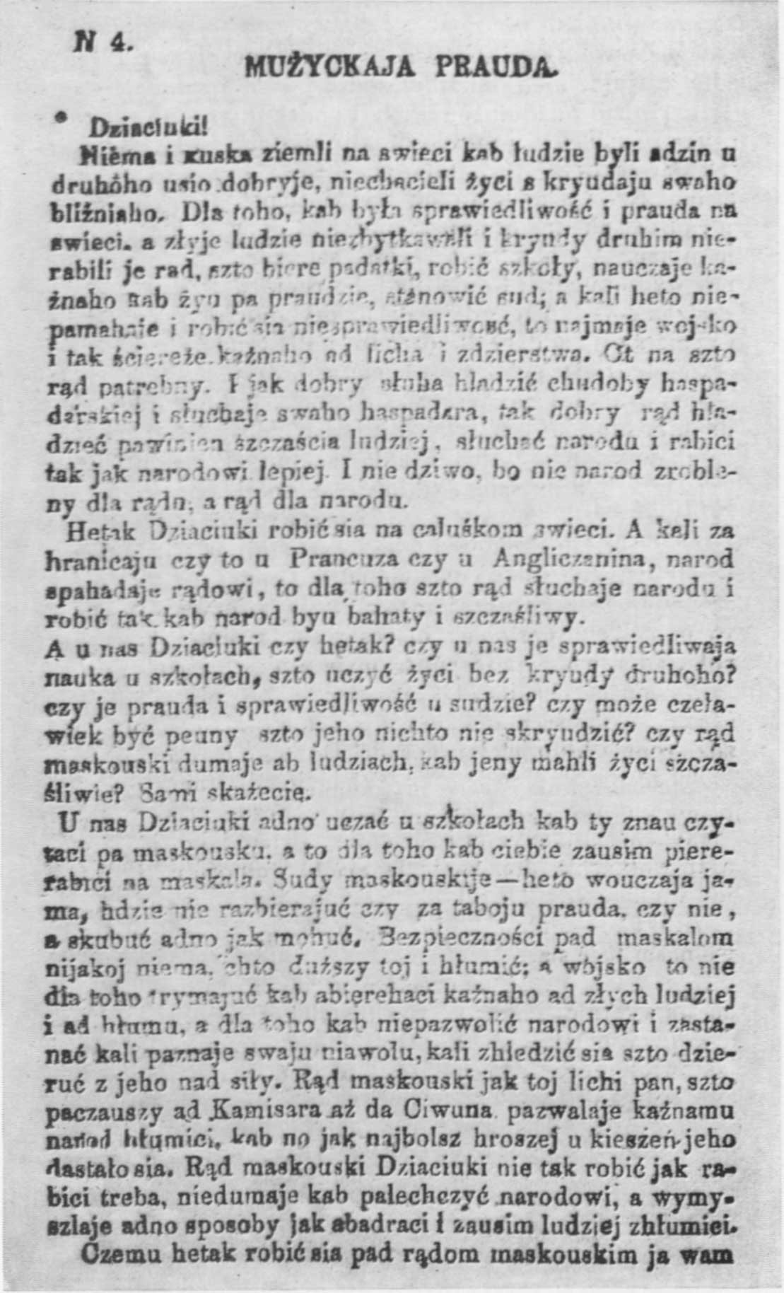 Маскалі*, чыноўнікі і многа паноў будуць перапыняць пісьмо наша да вас; но найдуцца людзі і з мужыкоў разумнейшыя, і з панскага роду, і з местачковых, што хочуць вашай свабоды, вашага шчасця – яны то вам самі гэта пісьмо даваці будуць, каб вы зналі, хто ваш прыяцель, а хто ваш вораг.