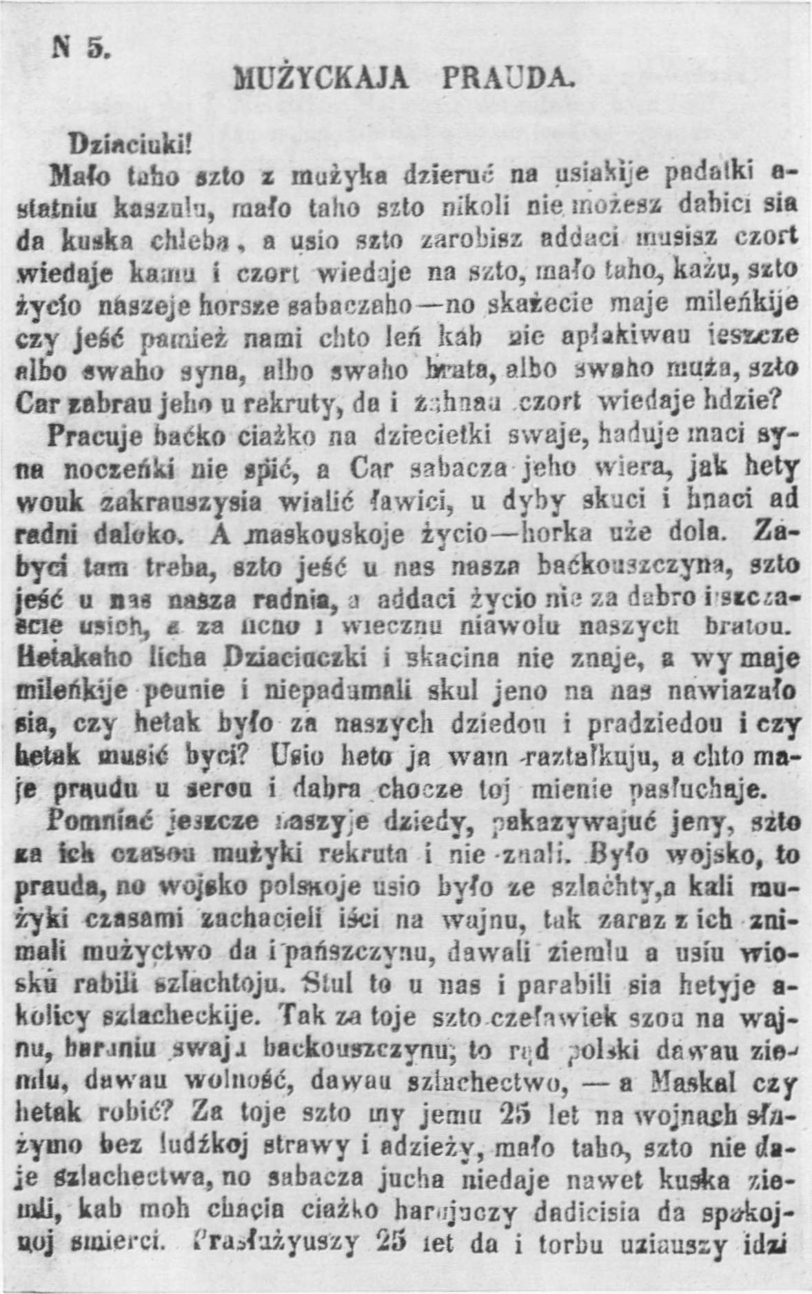 Помняць яшчэ нашыя дзяды, паказываюць яны, што за іх часоў мужыкі рэкрута і не зналі. Было войска, то праўда, но войска польскае ўсё было зэ шляхты, а калі мужыкі часамі захацелі ісці на вайну, так зараз з іх знімалі мужыцтва да і паншчыну, давалі зямлю, а ўсю вёску рабілі шляхтаю. Стуль то ў нас і парабіліся гэтыя аколіцы шляхецкія. Так за тое, што чалавек шоў на вайну, бараніў сваю бацькаўшчыну, то ронд* польскі даваў зямлю, даваў вольнасць, даваў шляхецтва, – а Маскаль* чы гэтак робіць? За тое, што мы яму 25 лет на войнах служымо без людскай стравы і адзежы, мала таго, што не дае шляхецтва, но, сабача юха*, не дае нават куска зямлі, каб мог, хаця цяжка гаруючы, дабіціся да спакойнай смерці. Праслужыўшы 25 лет да і торбу ўзяўшы, ідзі жабраваці!