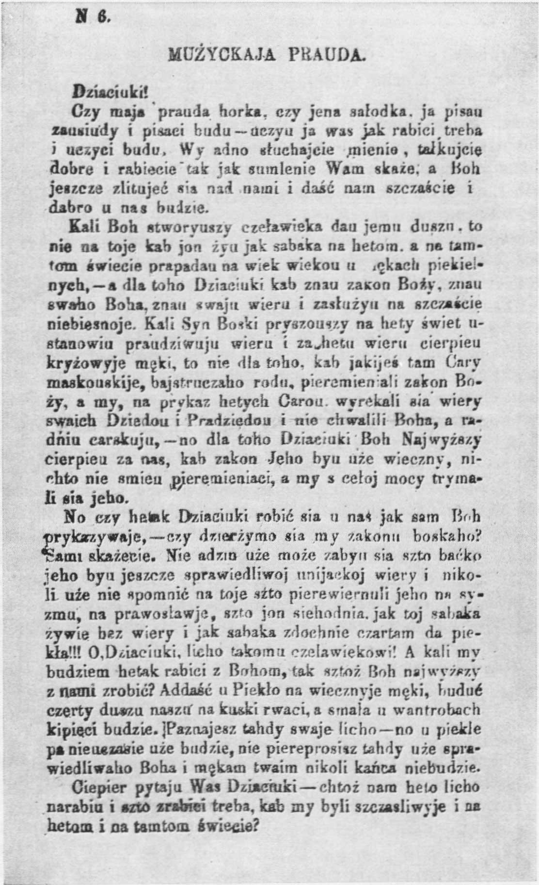 Калі Бог, стварыўшы чалавека, даў яму душу, то не на тое, каб ён жыў, як сабака, на гэтам, а на тамтам свеце прападаў на век вякоў у мэнках* пякельных, – а для таго, Дзецюкі, каб знаў закон Божы, знаў сва[й]го Бога, знаў сваю веру і заслужыў на шчасце нябеснае. Калі Сын Боскі, прыйшоўшы на гэты свет, устанавіў праўдзівую веру, і за гэту веру цярпеў крыжовыя мэнкі*, то не для таго, каб якіясь там Цары маскоўскія, байстручага роду перамянялі закон Божы, а мы, на прыказ гэтых Цароў, выракаліся веры сваіх Дзядоў і Прадзедаў і не хвалілі Бога, а радню Царскую, – но для таго, Дзецюкі, Бог Найвышшы цярпеў за нас, каб закон яго быў ужэ вечны, ніхто не смеў перамяняці, а мы з цэлай моцы трымаліся яго.