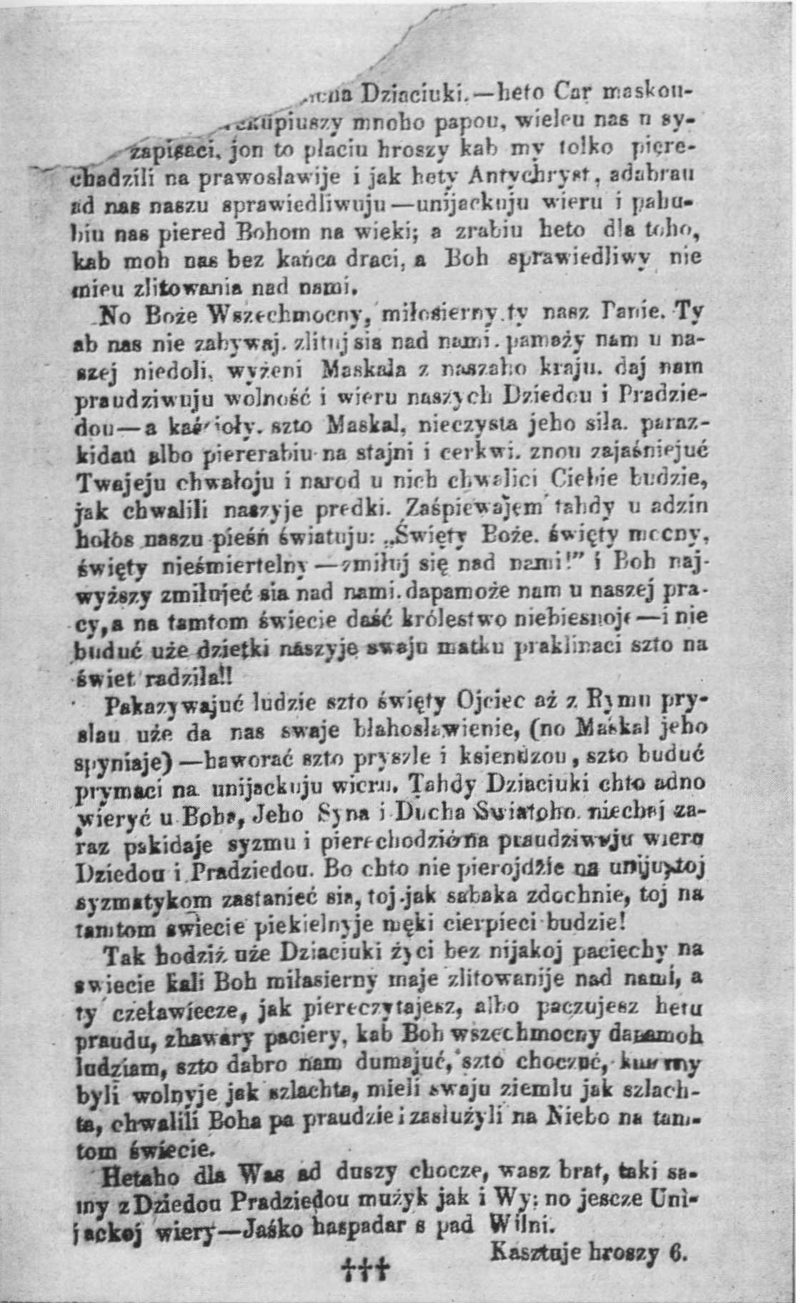 Паказываюць людзі, што свенты* Ойцец аж з Рыму прыслаў ужэ да нас свае благаславене (но Маскаль* яго спыняе) – гавораць, што прышле і ксяндзоў, што будуць прымаці на уніяцкую веру. Тагды, Дзецюкі, хто адно верыць у Бога, Яго Сына і Духа Святога, няхай зараз пакідае сызму* і пераходзіць на праўдзівую веру Дзядоў і Прадзедаў. Бо хто не пяройдзе на унію, той сызматыкам застанецца, той, як сабака, здохне, той на тамтам свеце пякельныя мэнкі* цярпеці будзе!