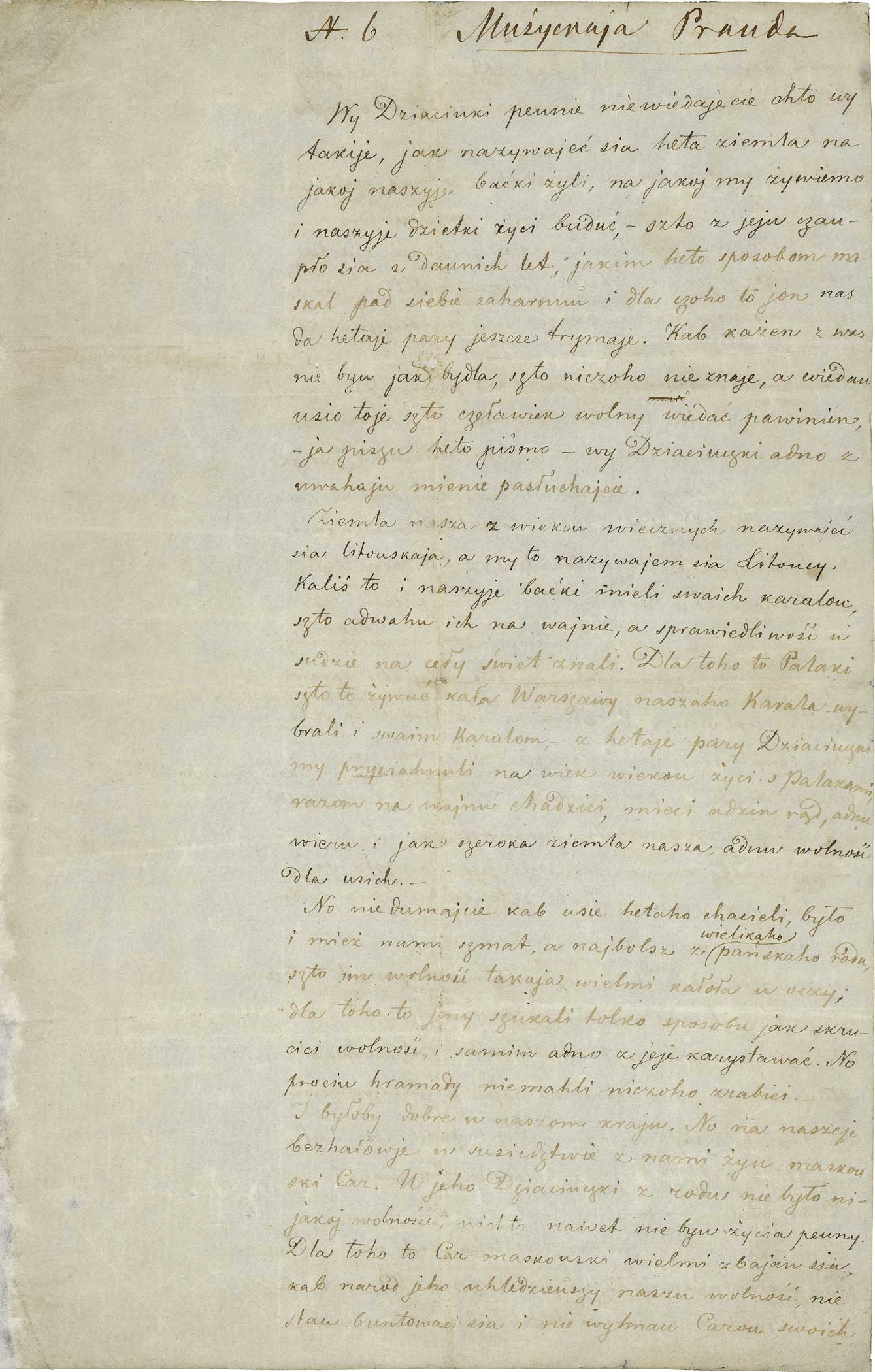 Вы, Дзяцюкі, пэўне, не ведаеце, хто вы такіе, як называецца гэта земля, на якой нашые бацькі жылі, на якой мы жывямо, і нашые дзеткі жыці будуць; што з ею чаўплося з даўніх лет, якім гэта спосабам маскаль пад сябе загарнуў, і для чаго то ён нас да гэтае пары яшчэ трымае. Каб кажэн з вас не быў, як быдла, што нічога не знае, а ведаў усё тое, што чалавек вольны ведаць1 павінен, я пішу гэта пісьмо — вы, Дзяцючкі, адно з увагаю мяне паслухайце.