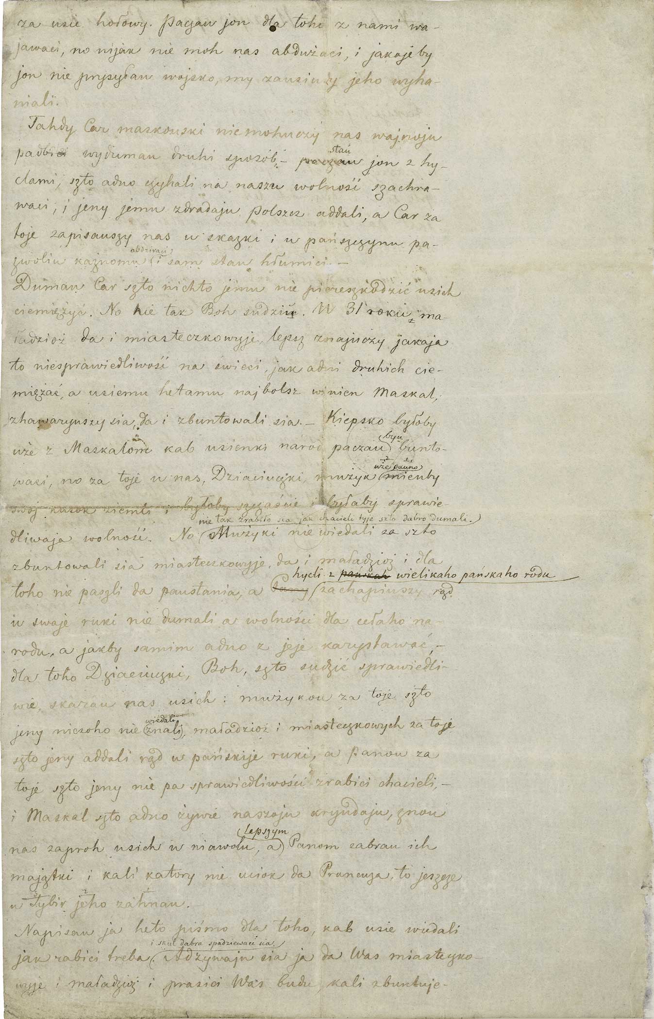 Напісаў я гэта пісьмо для таго, каб усе ведалі, як рабіці трэба, і скуль дабра спадзяваціся20. Адзываюся я да Вас, местачковыя і маладзёж, і прасіці Вас буду, калі збунтуецеся, то не аддавайце ў рукі паноў ніякага ронду — мы адно Вам будзем верыці, а то для21 таго, што адно вы самі22 гатовы жыццё сваё аддаці за нашу вольнасць.