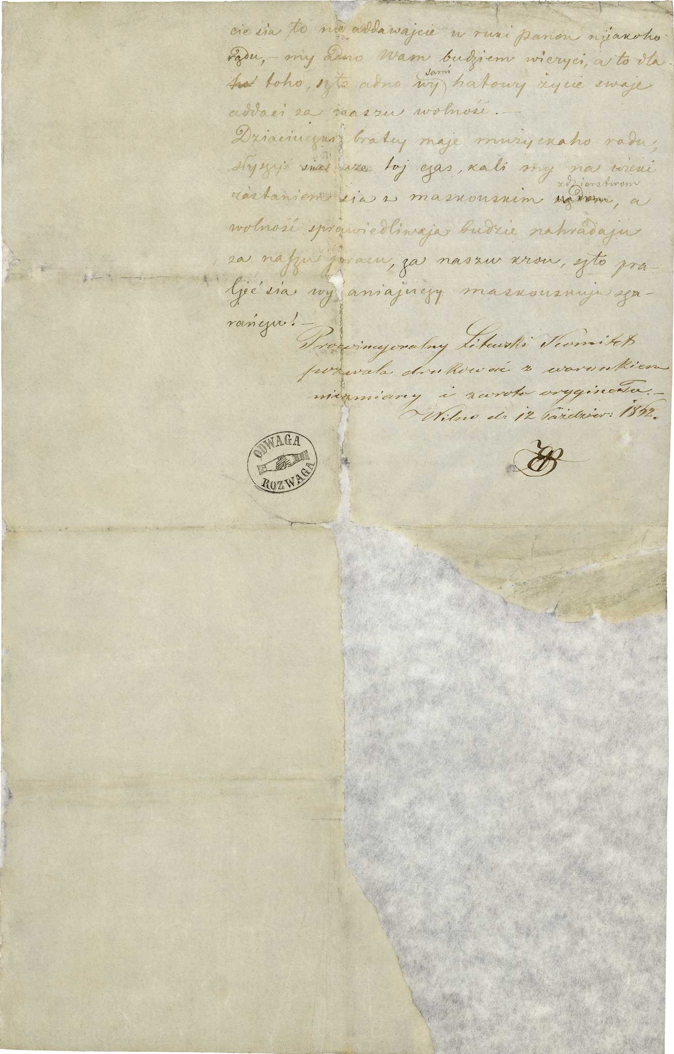 Атрамантам на трох аркушах стандартнага памеру, складзеных пазней у восем столак. Частка апошняга аркуша (вольная ад тэксту) адарваная. Пад польскамоўнай прыпіскай з дазволам на друк адбітак авальнай пячаткі Літоўскага правінцыйнага камітэта з выявай поціску рук і надпісам: “Odwaga Rozwaga”, а таксама манаграма, якая можа сведчыць пра аўтарства.