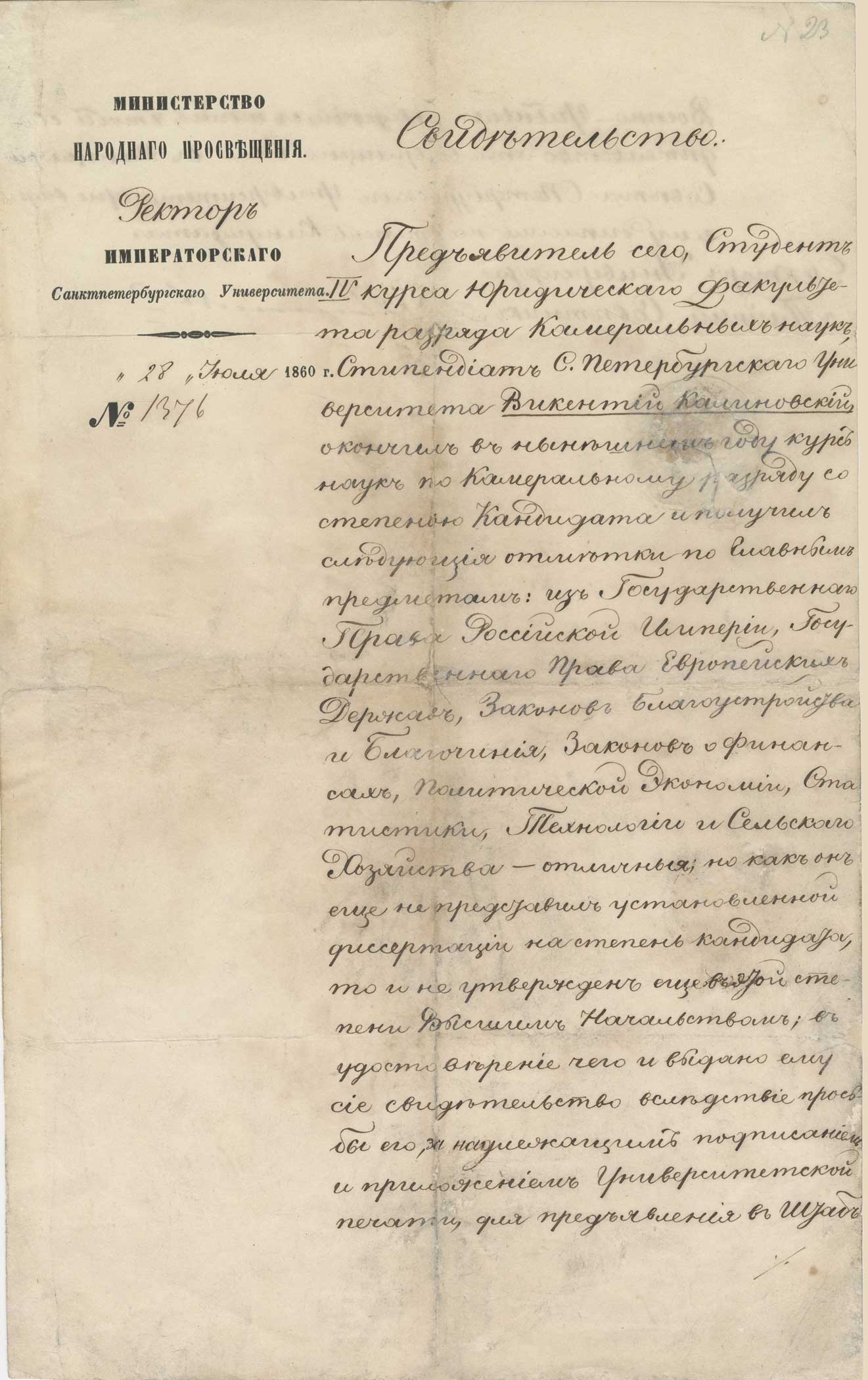 Предъявитель сего, Студентъ IV курса Юридическаго факультета разряда Камеральных наукъ, Стипендиатъ С. Петербургскаго Университета Викентій Калиновскій, окончилъ въ нынѣшнемъ году курсъ наукъ по Камеральному разряду со степенью Кандидата и получилъ слѣдующія отмѣтки по главнымъ предметамъ: изъ Государственнаго Права Россійской Имперіи, Государственнаго Права Европейскихъ Державъ, Законовъ Благоустройства и Благочинія, Законовъ о Финансахъ, Политической Экономіи, Статистики, Технологіи и Сельскаго хозяйства — отличныя; но какъ онъ еще не представилъ установленной диссертаціи на степень Кандидата, то и не утвержденъ еще въ этой степени Высшимъ Начальствомъ; въ удостовѣреніе чего и выдано ему сіе свидѣтельство вслѣдствіе просьбы его, за надлежащимъ подписаніемъ и приложеніемъ Университеской печати, Пасведчанне аб заканчэнні ўніверсітэта. Факсіміле для предъявленія въ Штабъ Военно-Учебныхъ заведеній, съ тѣмъ, чтобы свидѣтельство это возвращено было въ Канцелярію Совѣта СПетебургскаго Университета при выдачѣ ему диплома на степень Кандидата1.