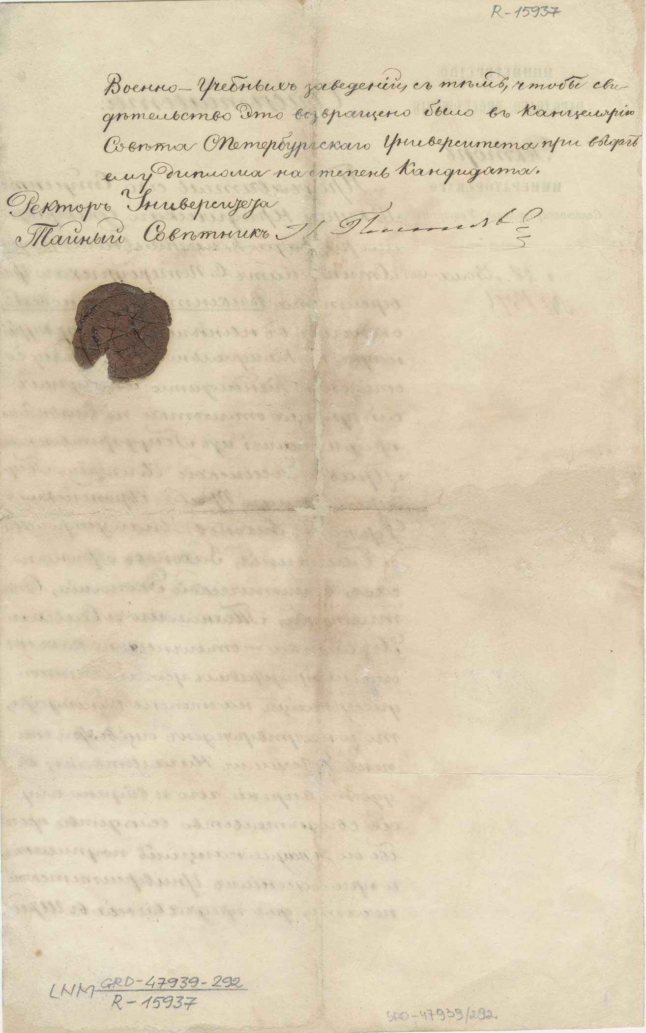 На бланку Санкт-Пецярбургскага ўніверсітэта. Змацаваны сургучовым адбіткам круглай універсітэц­кай пячаткі з гербам Расейскай імперыі і надпісам па акружнасці: “Печ.[ать] Императорскаго С.Петербург­скаго университета”.