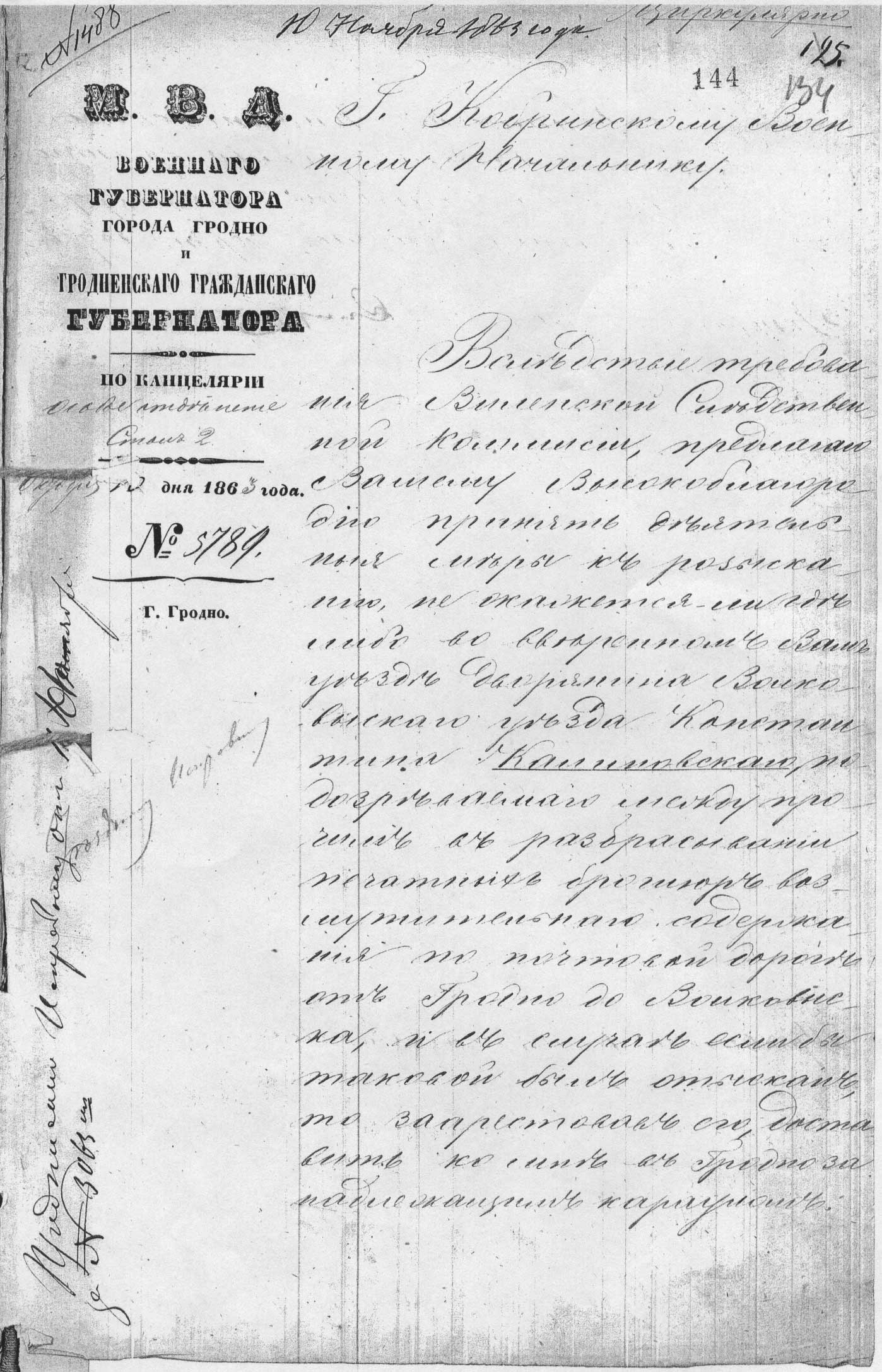 Вслѣдствіе требованія Виленской Слѣдственной Коммисіи, предлагаю Вашему Высокоблагородію принять дѣятельныя мѣры къ розысканію, не окажется ли гдѣ либо во ввѣренномъ Вамъ уѣздѣ дворянина Волковыскаго уѣзда Константина Калиновскаго, подозрѣваемаго между прочимъ въ разбрасываніи печатныхъ брошюръ возмутительнаго содержанія по почтовой дорогѣ отъ Гродно до Волковыска, и въ случае, если бы таковой былъ отысканъ, то, заарестовавъ его, доставить ко мнѣ въ Гродно за надлежащимъ карауломъ.