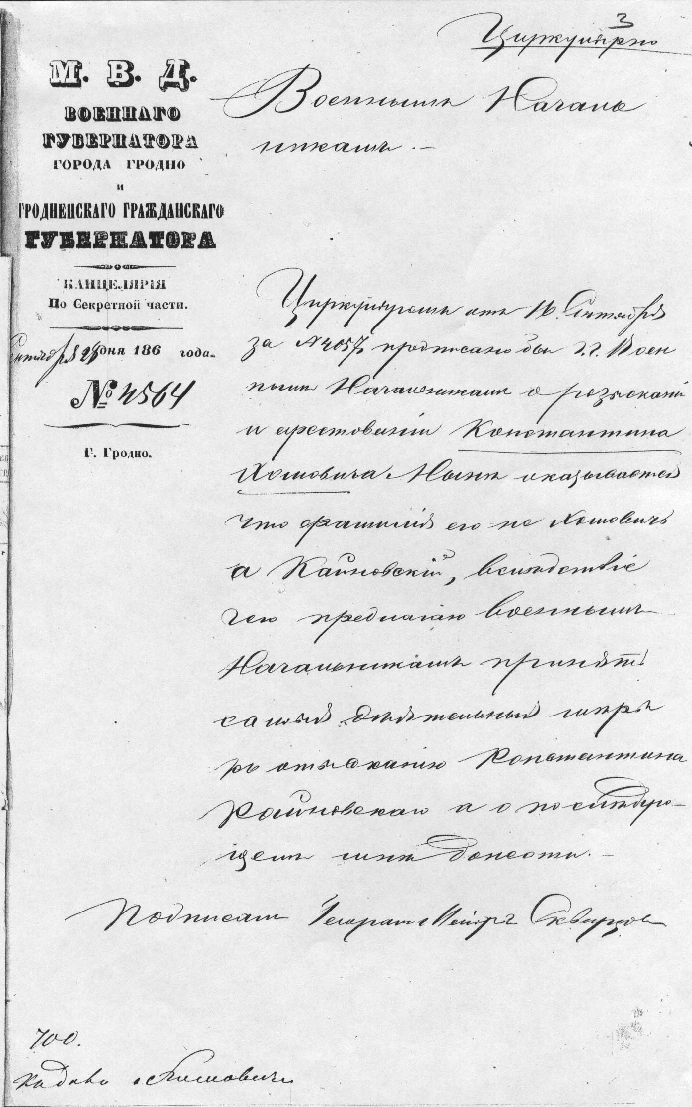Циркуляромъ отъ 16 Сентября за №4057 предписано бы г.г. Военнымъ Начальникамъ о розысканіи и арестованіи Константина Хомовича. Нынѣ оказывается, что фамилія его не Хомович, а Кайновскій, вслѣдствіе чего предлагаю военнымъ Начальникамъ принятъ самыя дѣятельныя мѣры по отысканію Константина Кайновскаго, а о послѣдующемъ мнѣ донести.