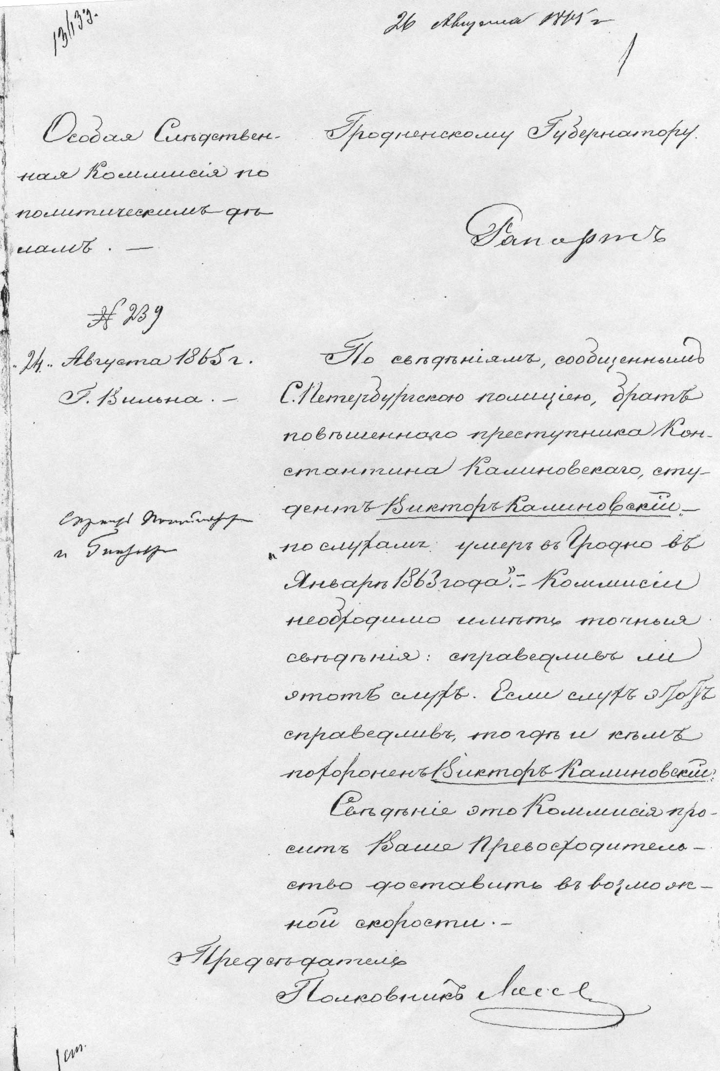 По свѣдѣніямъ, сообщеннымъ С.Петербургскою полиціею, братъ повешеннаго преступника Константина Калиновскаго, студентъ Викторъ Калиновскій, по слухамъ, умеръ въ Гродно въ Январѣ 1863 года. Коммисіи необходимо имѣть точныя свѣдѣнія: справедливъ ли этотъ слухъ. Если слухъ этотъ справедливъ, то гдѣ и кѣмъ похороненъ Викторъ Калиновскій?