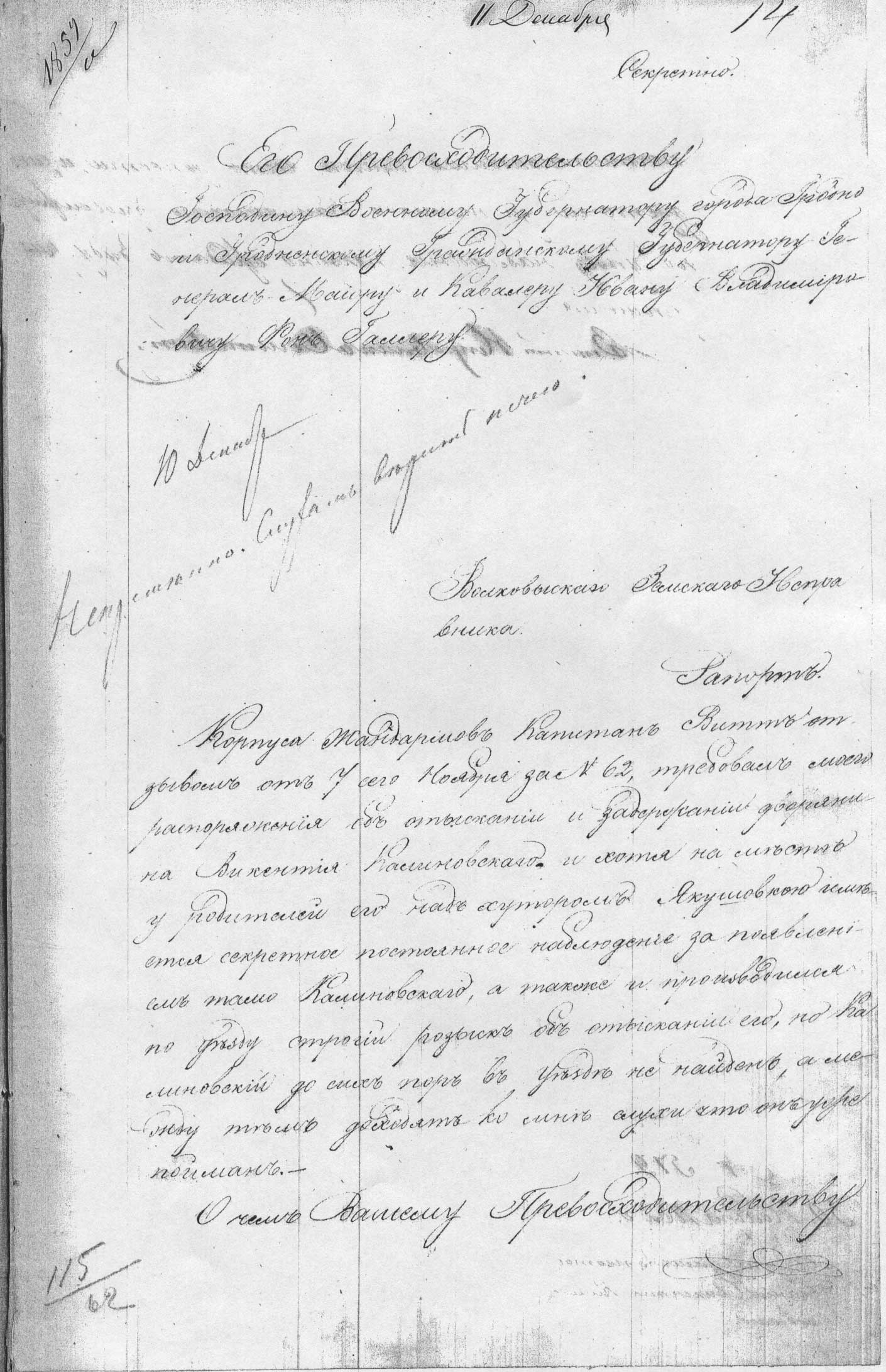 Корпуса жандармовъ Капитанъ Виттѣ отзывомъ отъ 7 сего Ноября за №62 требовалъ моего распоряженія объ отысканіи и задержаніи дворянина Викентія Калиновскаго, и хотя на мѣстѣ у родителей его надъ хуторомъ Якушевкою имѣется секретное постоянное наблюденіе за появленіемъ тамъ Калиновскаго, а также и производится по уѣзду строгій розыскъ объ отысканіи его, но Калиновскій до сихъ поръ въ уѣздѣ не найденъ, а между темъ доходятъ ко мнѣ слухи, что онъ уже пойманъ.