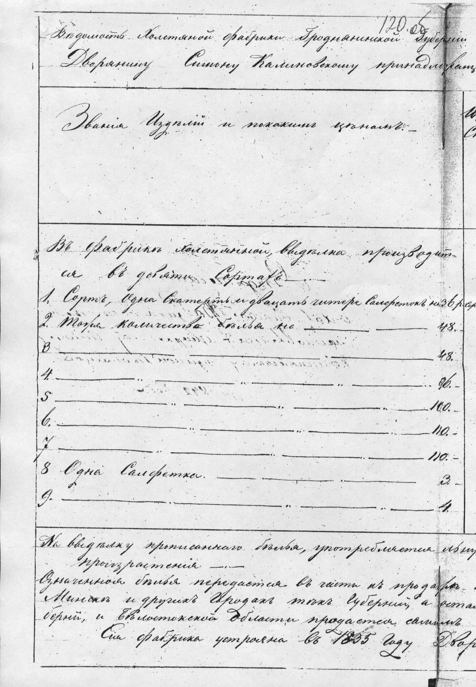 На выдѣлку прописаннаго бѣлья употребляется льну пудовъ 250 изъ пріобрѣтеннаго мѣстнаго произрастенія Означенное бѣлье передается въ части къ продажѣ по лавкамъ фабрикантамъ въ городахъ Вильнѣ, Минскѣ и другихъ городахъ тѣхъ губерній, а остальное по разнымъ мѣстамъ Гродненской губерніи и Бѣлостокской области продается самимъ фабрикантомъ. Сия фабрика устроена въ 1835 году Дворяниномъ Симономъ Калиновскимъ.
